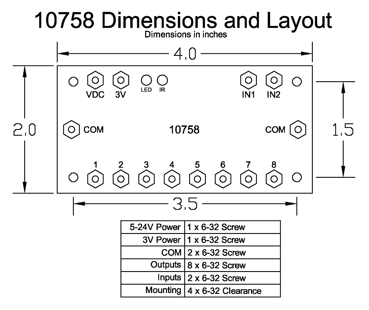 Model 10758 is a 5-48VDC solenoid sequencer. The outputs are activated in sequence on a negative transition of the activate terminal. The activation terminal can be connected through a momentary switch to the common terminal. The outputs are activated in order from left to right for each negative transition of the activate terminal. After the last output has been energized, transitions on the activate terminal are ignored. A negative transition on the reset terminal will reset the sequence such that the left most terminal is energized on the next activation.