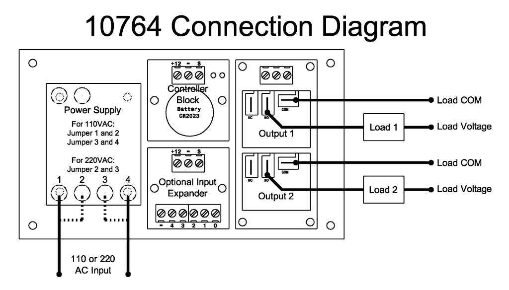 Model 10764 is a 110 or 220 VAC interval timer. The mechanical dual output can switch AC or DC loads up to 30A. The minimum interval time is 100 ms (0.1s). Interval sequences can be started when the timer is powered or using the optional input expander. This package includes the power supply, controller, dual 30A relay output, and aluminum mounting plate. The input expander is not included. The intervals and settings are transferred into the timer through an infrared programmer, providing complete isolation from switching current.