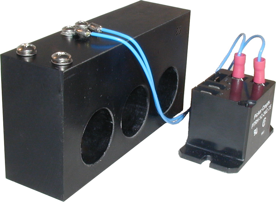 Model 9616 is a low cost current switch with maximum currents of 25A, 50A, 100A, or 250 A. This three phase current sensor comes with a 30A zero crossing mechanical relay. The relay has .250 male QC terminals for COM, NO, and NC. The current trip point is continuously adjustable by a 25 turn adjustment screw. |