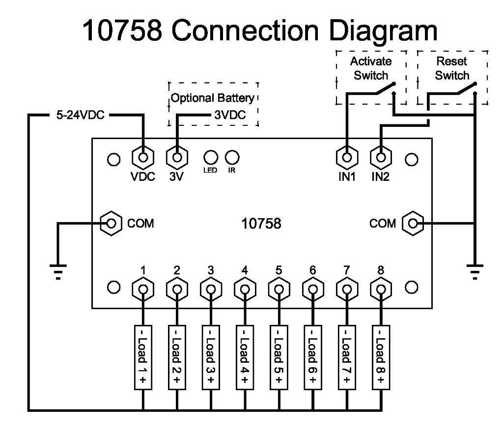 Model 10758 is a 5-48VDC solenoid sequencer. The outputs are activated in sequence on a negative transition of the activate terminal. The activation terminal can be connected through a momentary switch to the common terminal. The outputs are activated in order from left to right for each negative transition of the activate terminal. After the last output has been energized, transitions on the activate terminal are ignored. A negative transition on the reset terminal will reset the sequence such that the left most terminal is energized on the next activation.