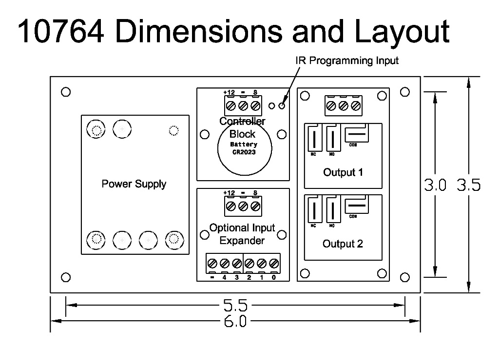 Model 10764 is a 110 or 220 VAC interval timer. The mechanical dual output can switch AC or DC loads up to 30A. The minimum interval time is 100 ms (0.1s). Interval sequences can be started when the timer is powered or using the optional input expander. This package includes the power supply, controller, dual 30A relay output, and aluminum mounting plate. The input expander is not included. The intervals and settings are transferred into the timer through an infrared programmer, providing complete isolation from switching current.