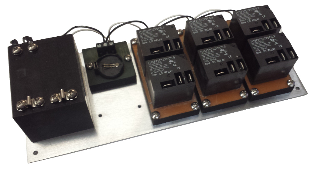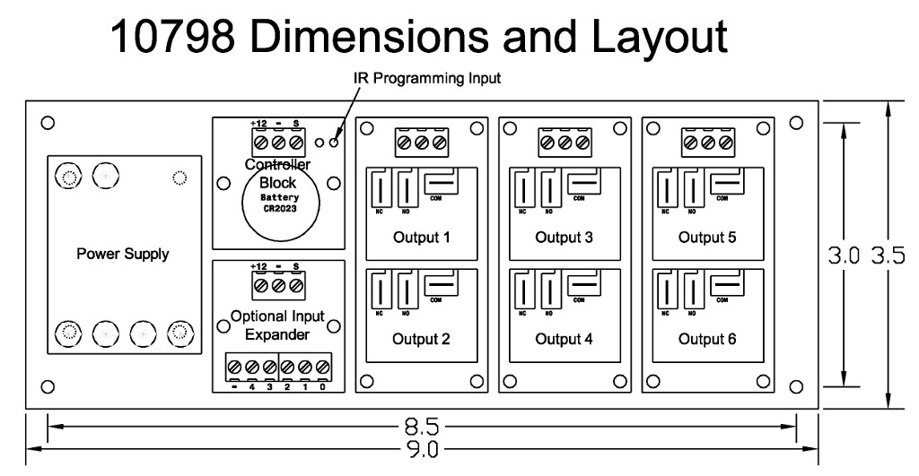 ProductModel 10798 is a 110 or 220 VAC interval timer. The six mechanical output relays can switch AC or DC loads up to 30A. The minimum interval time is 100 ms (0.1s). Interval sequences can be started when the timer is powered or using the optional input expander. This package includes the power supply, controller, six 30A relay output, and aluminum mounting plate. The input expander is not included. The intervals and settings are transferred into the timer through an infrared programmer, providing complete isolation from switching current.